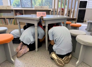随后空袭警报鸣响,教室及专用教室内的学生立即成双手抱头姿势,快速躲至课桌下方,避免靠近窗口与门口;讲台旁的老师则蹲在角落做好防护;在操场上躲避的学生按照要求,双手抱头、面部朝下、护住耳朵、用手肘支撑地面卧倒,最大限度减少身体暴露面积,防范坠落物伤害。